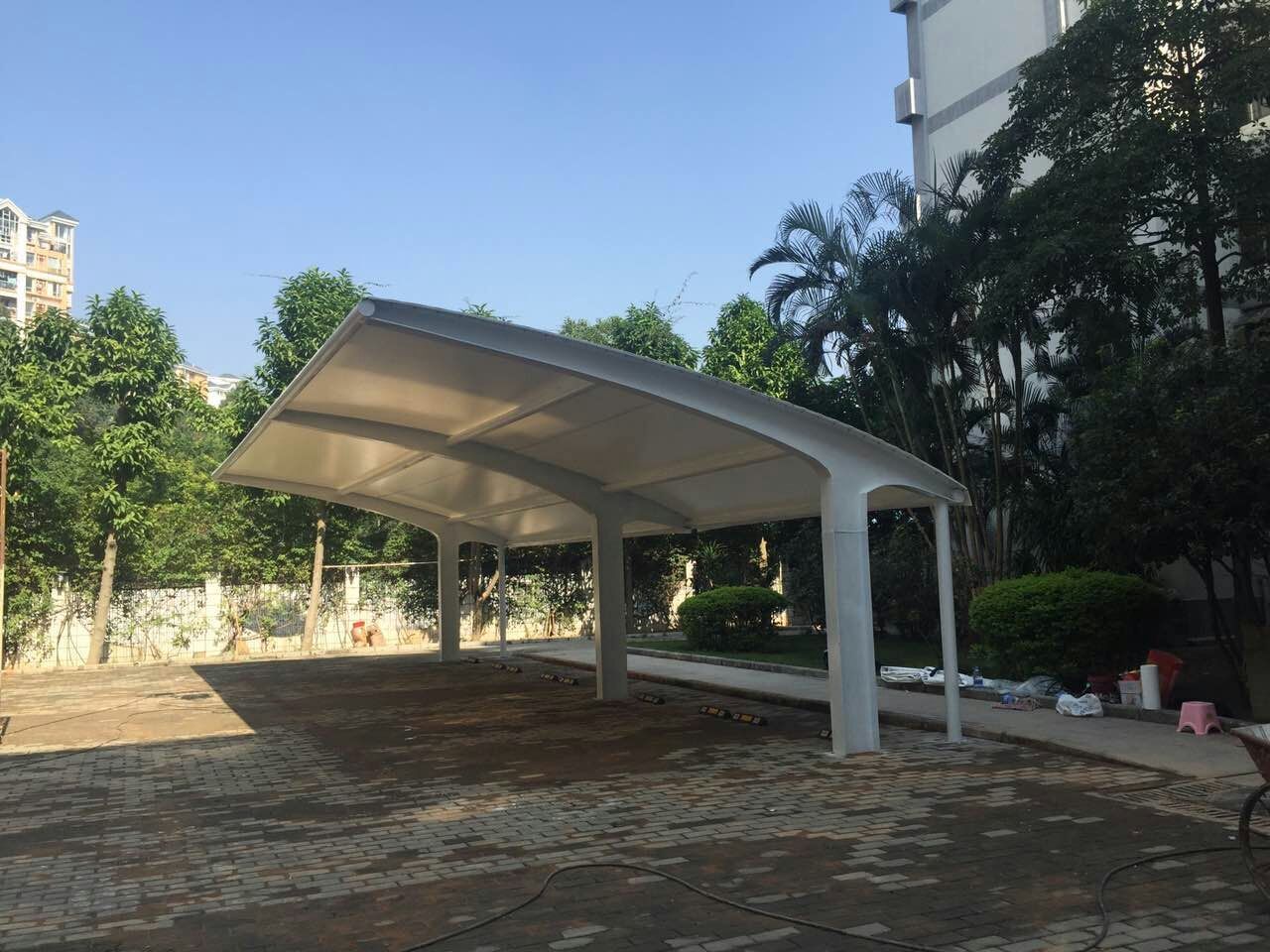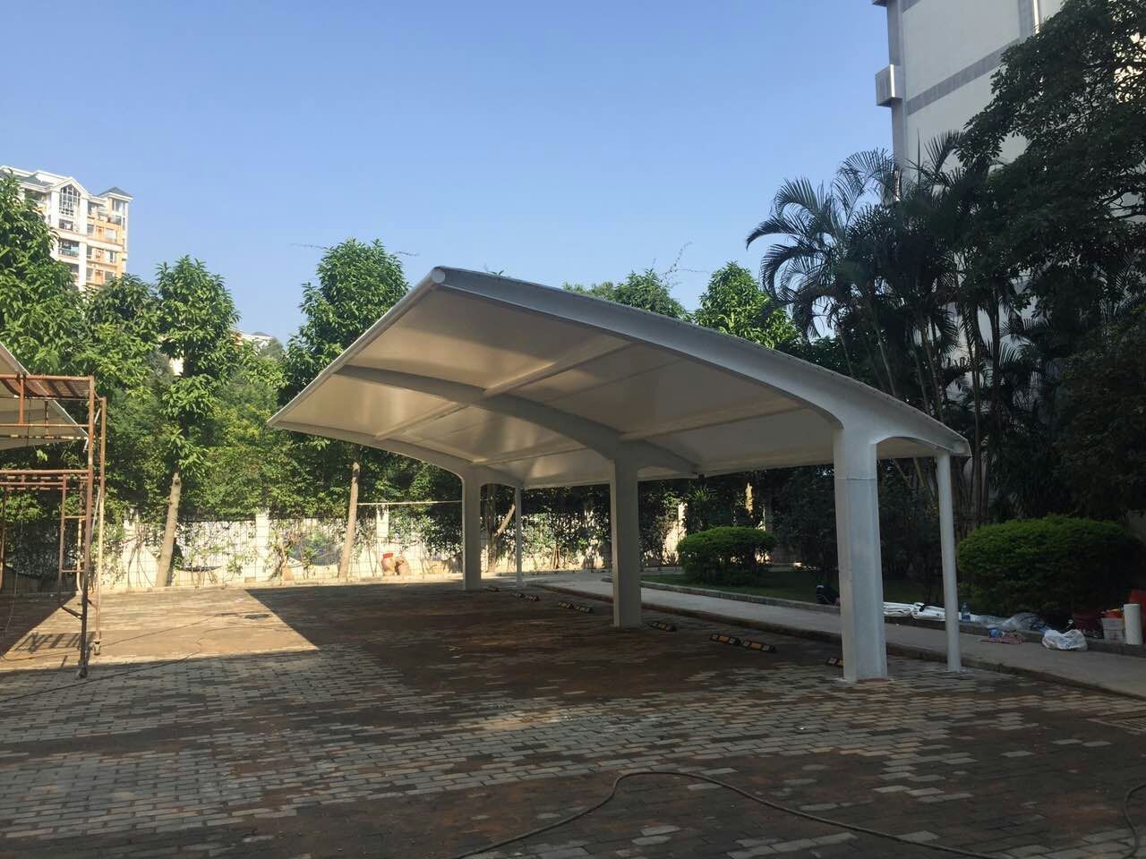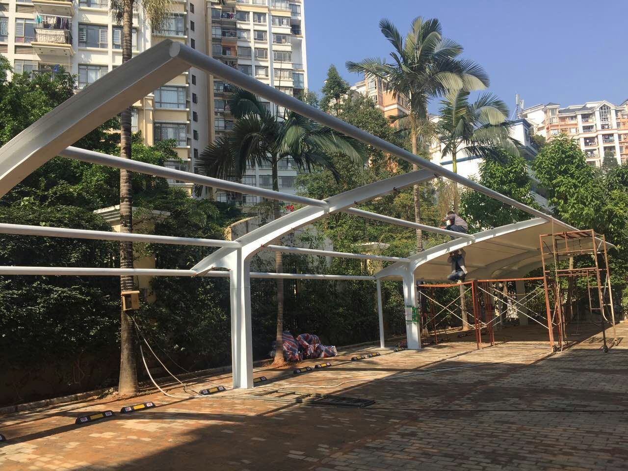 深圳市布吉高級中學膜結構停車棚施工中,張拉膜車棚,停車棚膜結構。工程:面積280平方米,工程地點:布吉高級中學,工期:6天。